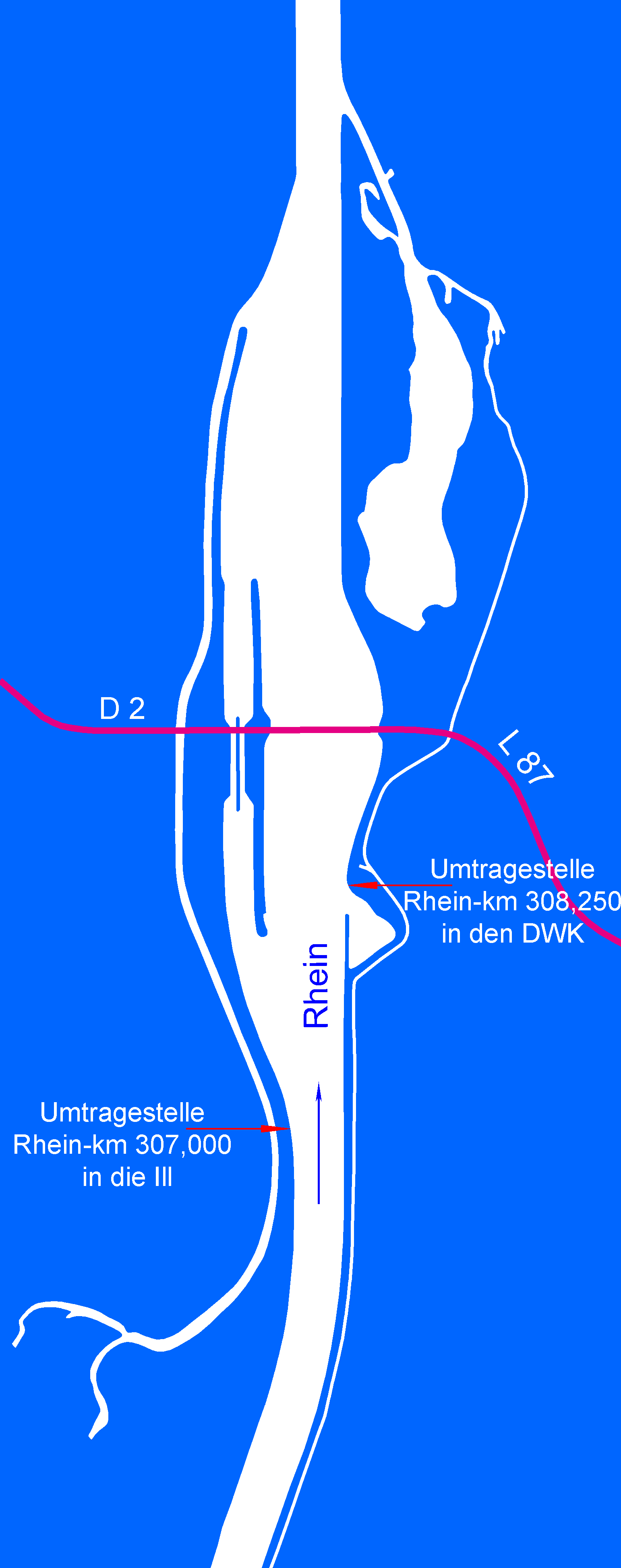 1. Beim Rhein-km 326,900 befindet sich rechts eine Rampe zum Aussetzen. Man rollt dann per Boots-wagen bequem die Rampe hinunter zur Einsetzstelle in den Druckwasser-kanal. Im Durckwasserkanal, mit Strömung - im Sommer evtl. verkrautet - hält man sich links (nicht rechts in die Seitengewässwer einfahren). Man kommt dann über ein Verbindungsgewässer zum Sandbach der unterhalb der Staustufe in den Rhein mündet. (Schnell und bequem)